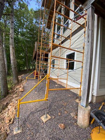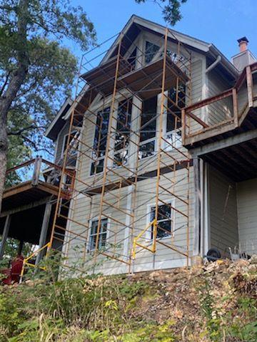 On a recent project we completed, our abilities were put to the test to access a 35-foot peak on the rear side of a home. If this were on flat ground with concrete below, it would not be much of a problem. However, this particular project was for a home that backed up to a steep incline of woods with extremely rocky terrain. Not only that but we had to build this scaffolding between two decks which posed its own unique challenge. After meeting with our safety consultants, we were able to build a 30-foot scaffold to access the toughest areas of the home. By doing so, our painters were able to safely harness themselves to a secured structure while being able to closely work on the rear side of the home to properly prepare and finish it.