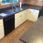 Our process included sanding, priming, and spraying. Additionally, our carpenter installed faux panels to the upper cabinets and three sides of the kitchen island; this added an incredible depth and achieved that custom look. As for color, we used two coats of Sherwin Williams’ Pro-Classics matched to Porter’s Horseradish 315-1.