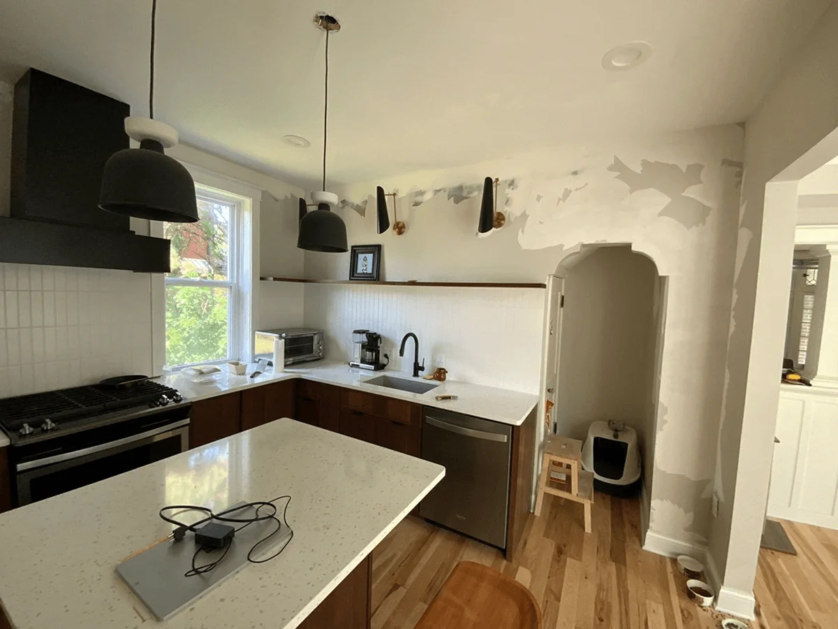 This historic home had undergone a complete kitchen remodel before our arrival. The scope of our work included painting the ceiling, priming the walls, applying a fresh coat of Sherwin Williams Interior Duration Home in the color Gossamer Veil on the walls, smoothing out the edges, and meticulously painting baseboards and two doors using the Sherwin Williams color Pure White. We also managed to complete the project ahead of schedule, finishing it in mid-October despite the initial estimate for early November.
